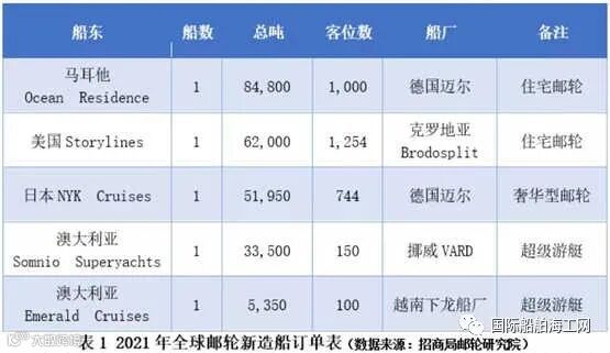 迄今为止,2021年初共产生5艘邮轮订单,其中2艘为商业模式较为特殊的房地产型邮轮,2艘为超级游艇。具体如下: