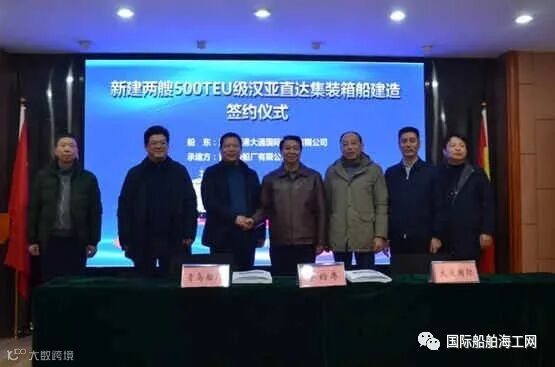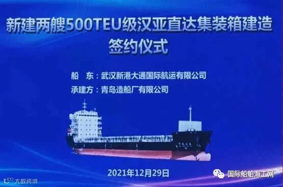 2021年12月29日,在武汉华中港航集团,武汉新港大通国际航运有限公司与青岛造船厂有限公司(以下简称青船公司)签订了2艘500TEU级汉亚直达集装箱船舶建造合同。
