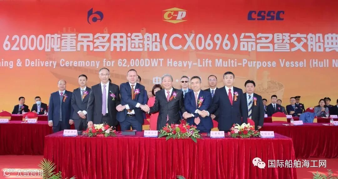 西港池码头上,新船彩旗招展,巍然静泊。这是目前世界载重吨位最大多用途重吊船。交银租赁、中船贸易、中船澄西船厂、中波公司四方领导现场签署了交船文件。