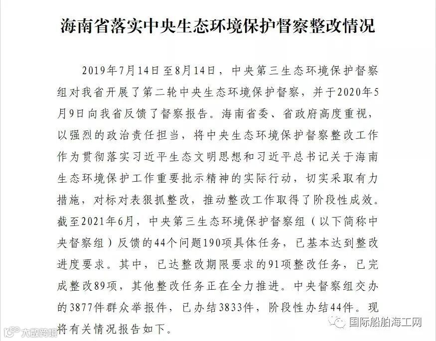 根据整改情况,截至2021年6月,中央第三生态环境保护督察组反馈的44个问题190项具体任务,海南已基本达到整改进度要求。其中,已达整改期限要求的91项整改任务,已完成整改89项,其他整改任务正在全力推进。督察组交办的3877件群众举报件,已办结3833件,阶段性办结44件。