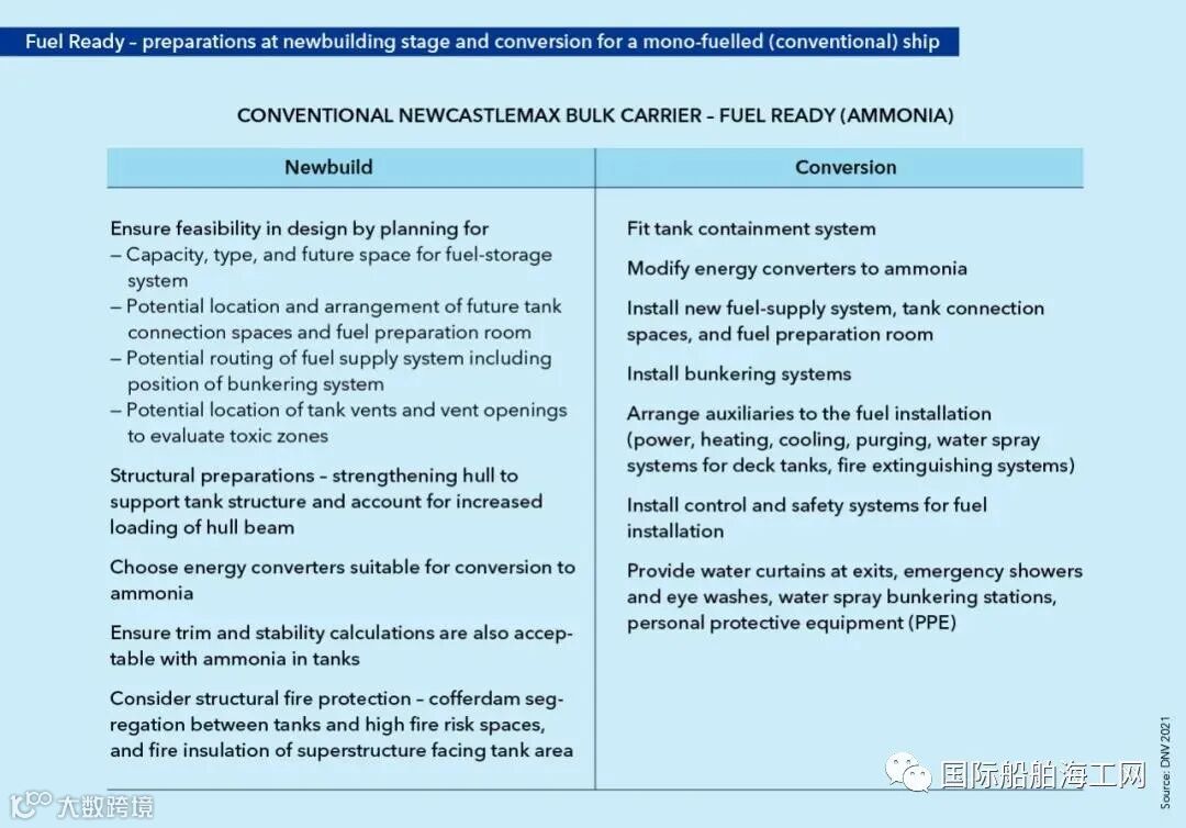 例如,下表显示了Newcastlemax型散货船从单燃料(传统燃料)转为氨燃料的审查过程中,需要采用的行动要点。
