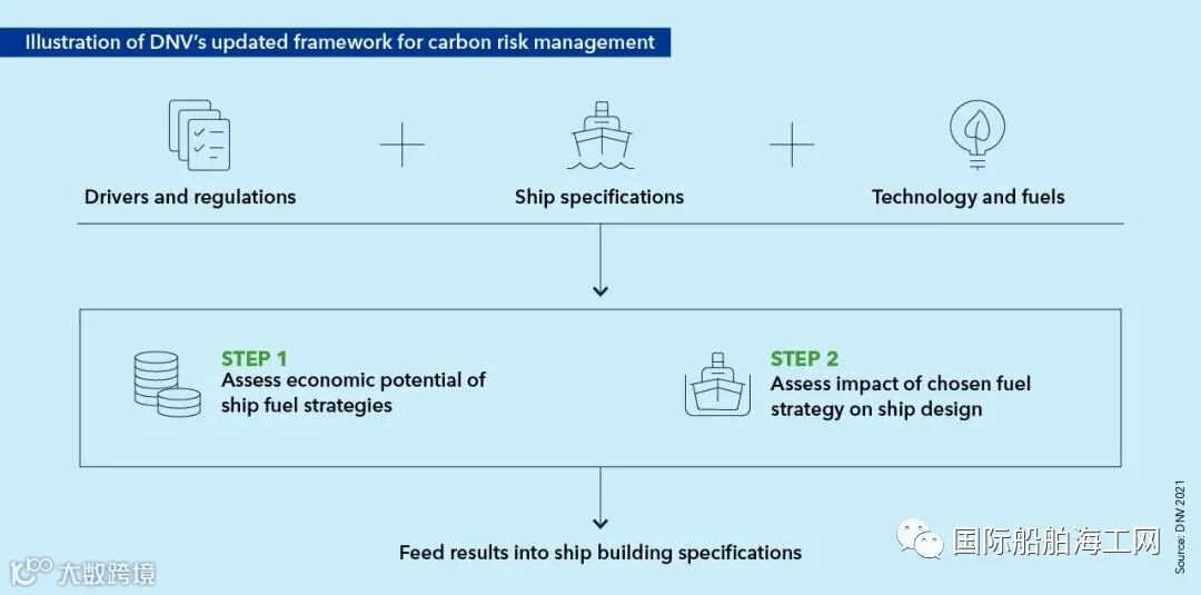 为帮助船东响应脱碳行动,DNV绘制了符合碳减排轨迹的实用路径。《面向2050年的海事展望》提供了最新的碳风险管理框架(图1),为船舶找到了最具性价比的Fuel Ready及燃料灵活性的选择。