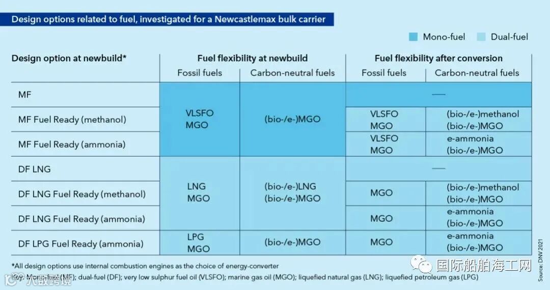 表2:Newcastlemax型散货船关于燃料的设计选项,显示了每个设计选项在新造和后续改造(如适用)中的燃料灵活性。