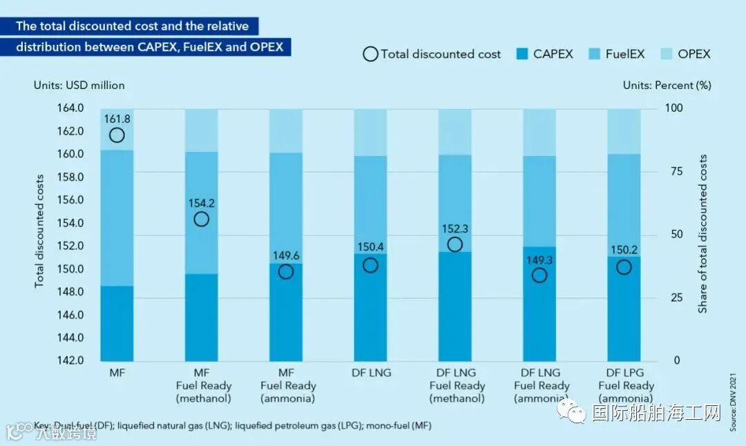 3、折扣成本最低的两种设计选项是MF Fuel Ready(氨)和双燃料(DF)LNG Fuel Ready(氨)。研究认为,DF LPG Fuel Ready(氨)也是低成本的选项之一,但没有深入探讨。