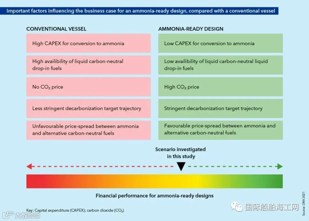 图3:与常规船舶相比的氨燃料设计的重要影响因素。但在因素发生变化的场景下,其他设计可能优于氨燃料设计。