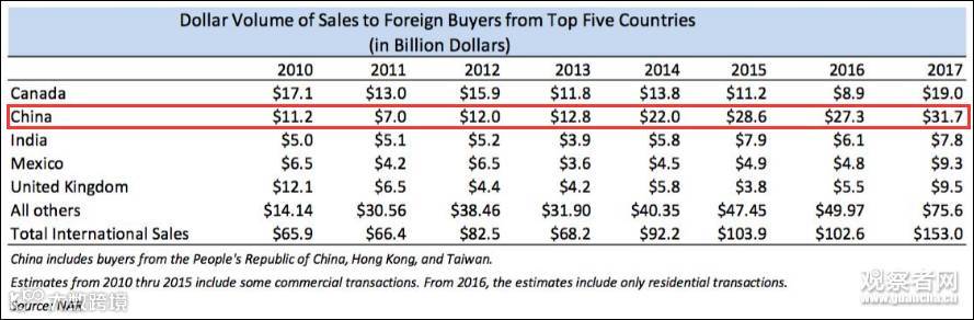 最近8年,外国人购买美国房产金额(单位:十亿美元)