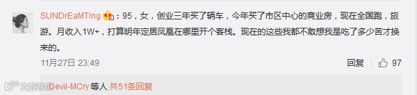 她说“现在大家都惧怕中年危机,可在我看来,钱能解决大部分的难题,我不怕变老,我怕没钱。”