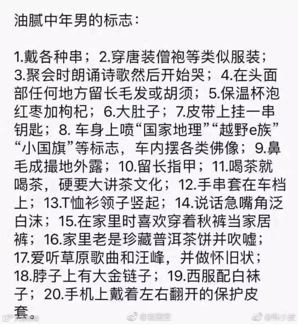 保温杯泡红枣加枸杞,皮带上挂一串车钥匙,挺着啤酒肚在公众场合高谈阔论…这好像是现在中年油腻男人的标配。