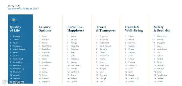 生活质量排名在这个排名中,进步最大的是葡萄牙,从去年的14名提高到今年的第1名,成为向在国外工作的人提供最好生活品质条件的国家和地区。