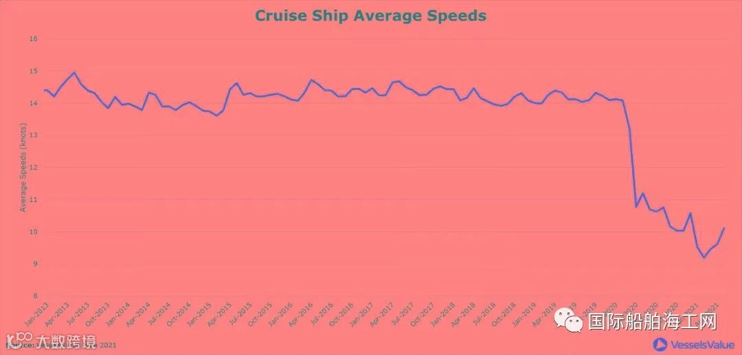 历史上,全球邮轮一直保持活跃,平均航速基本保持在14节上下。这在2020年3月14日美国疾病控制与预防中心(CDC)下达了禁运令后,显著下降到10节。