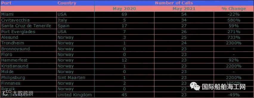 欧洲国家在2021年5月的邮轮靠泊数显著增加。因为邮轮恢复航行后,意大利奇维塔韦基亚港(Civitavecchia)的靠泊数同比增加了580%。挪威众多港口的靠泊数也显著增加。