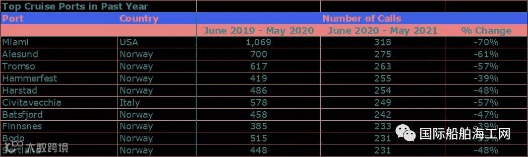上表显示了新冠疫情对邮轮行业的影响。2019.06到2020.05期间,美国迈阿密港有超过1000次的邮轮靠泊,但在之后一年下降了70%,只有318次。欧洲的港口靠泊活动也下降了50%,因为更多的邮轮被迫闲置或进行非盈利航行。到年底,该行业的真正指标将是靠泊数,特别是与2019年、2020年和2021年的比较。