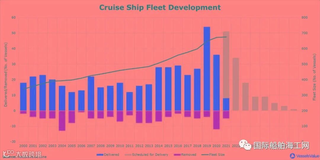 图3显示了2000年以来全球邮轮船队的发展。红色的柱状图显示的是当年交付的船只的数量,黄色显示的是被拆除的船只的数量。灰色显示的是未来增长量。