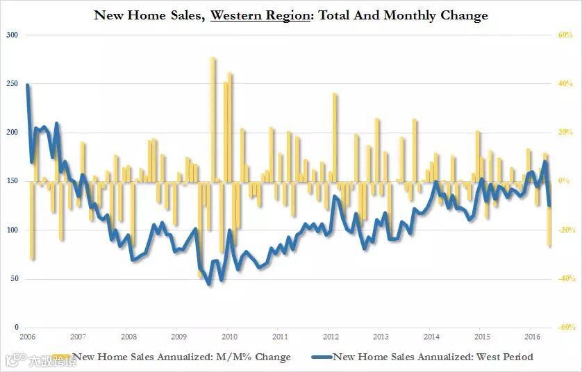 分地区来看,美国西部地区的新屋销售暴跌26.3%,跌至2015年10月以来最低,而3月前值则增长16.7%至2007年7月以来最高。东北部地区销售下降7.5%,从2月以来波动较大,2月时曾骤降21.4%,3月时又暴涨25.8%。南部地区销售下降4%,中西部地区销售再度下滑13.1%。