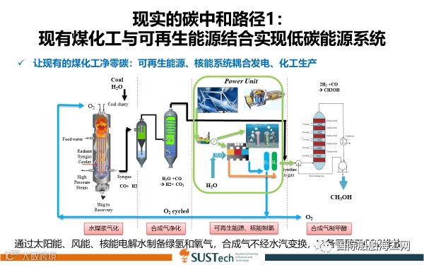 我个人觉得,从中国的天然能源禀赋和工业基础来看,中国有很成熟的煤制甲醇技术,只是要产生很多的二氧化碳,因为要补氢以达到甲醇合成所需要的碳氢比,然而通过水煤气变换将一氧化碳转化成氢气的同时会排放二氧化碳。如果那部分的氢可以在西部用太阳能和风能制,同时副产氧气供煤气化用,能够解决很多排放问题;煤制甲醇的工厂里,空气深冷分离制氧气的空分装置是投资最大的,这块投资未来省下来可以做太阳能电解水装置生产氧气和氢气供煤制甲醇用,这样煤转成甲醇就不用排放二氧化碳,再用甲醇作为能源的载体就可以做到减碳60%以上,这可能是未来比较现实的一条碳中和路线。说穿了是利用现有的基础设施把太阳能以甲醇液体的形式储存下来;这是未来风能,太阳能储能的另外一条途径。