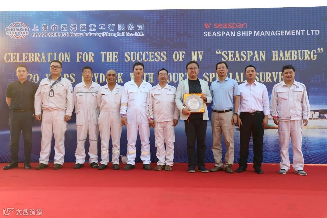9月22日,上海中远海运重工为SEASPAN SHIP MANAGEMENT公司在厂修理船舶MV“SEASPAN HAMBURG”轮举行20周年特检完工纪念仪式,SEASPAN公司中国区副总裁李堃、中远海运集运、船舶代理公司等相关领导,上海中远海运重工副总经理(主持工作)浦洪彬、总管小组团队等参加仪式。