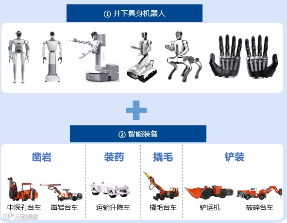 具身智能的另一核心优势是泛化性能——即便在地下2000米的复杂岩石环境中,或面对多样化工种需求时,装备也能自主决策、灵活适应。例如,将传统的凿岩装备、升降机、采运车与具身机器人结合,可实现复杂环境下的无人化作业。