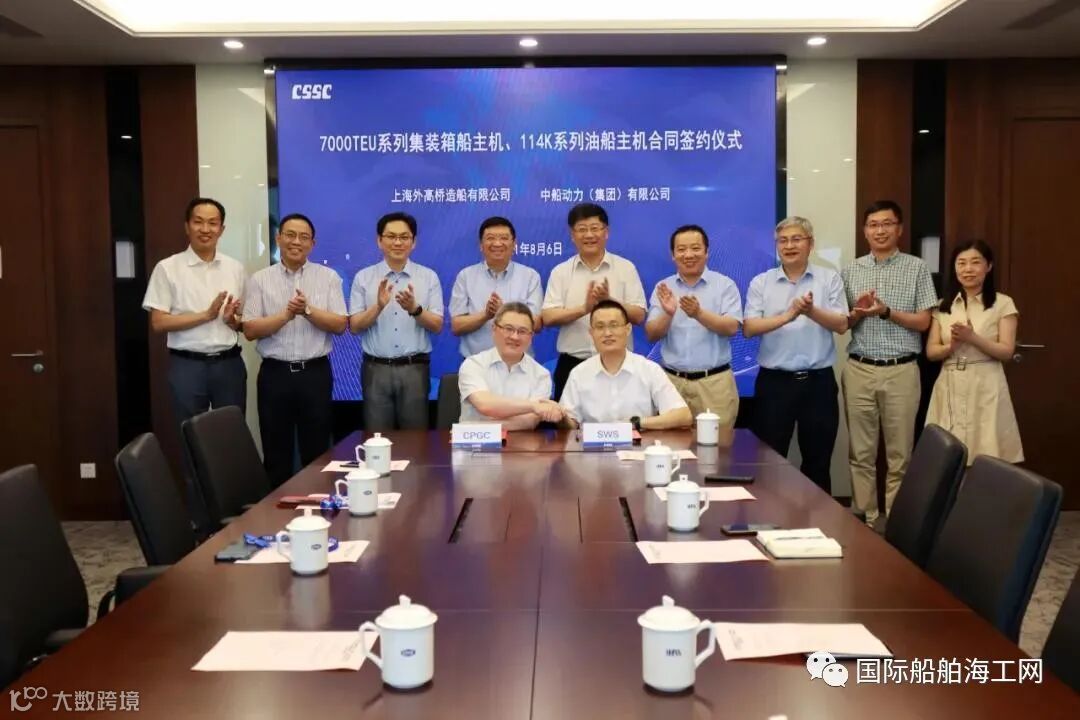 8月6日,外高桥造船公司与中船动力(集团)有限公司举行系列船主机合同签约仪式。公司党委书记、董事长王琦,党委副书记、总经理陈刚,党委副书记袁飞鹏,及中船动力党委书记、董事长李琤,党委副书记、总经理邵煜等相关领导出席仪式。公司副总经理张启鹏、中船动力副总经理裘春华代表双方在合同上签字。。此次签约有助于双方整合各自品牌资源形成强大合力,进一步提高和丰富各自品牌产品核心竞争力内涵,双方今后瞄准FGSS系统等高附加值产品,共同构建更具竞争力和话语权的动力产业生态链。
