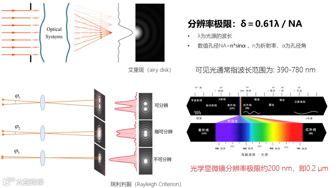 显微镜性能中最重要的一个指标是分辨率,我们可以简单理解为能扩多大、看多小。光以波的形式传播,当一个点光源通过透镜在成像面聚焦为一个小光点时,不管物镜有多好,成像光点都会比实际的发光点大。这是因为光波在物镜光阑的边缘会发生衍射,将波前向外扩散。衍射光斑有一个明亮的中心点,以及环绕它的一系列亮度渐弱的衍射环,称为艾里斑。当两个点过于靠近,所成的像斑重叠在一起,就难以分辨出是两个点。因此,光学显微镜的分辨率存在一个极限(也称阿贝极限)。