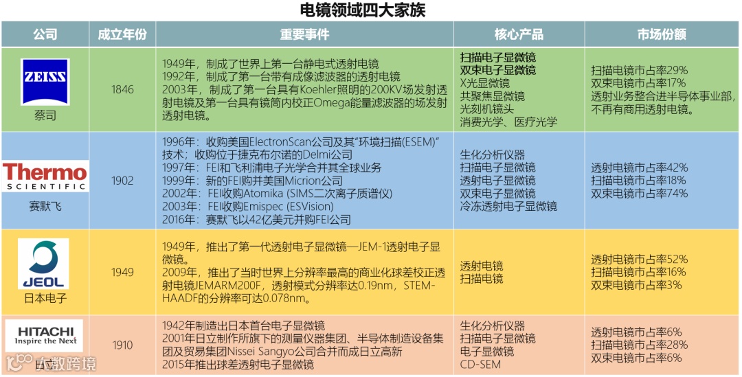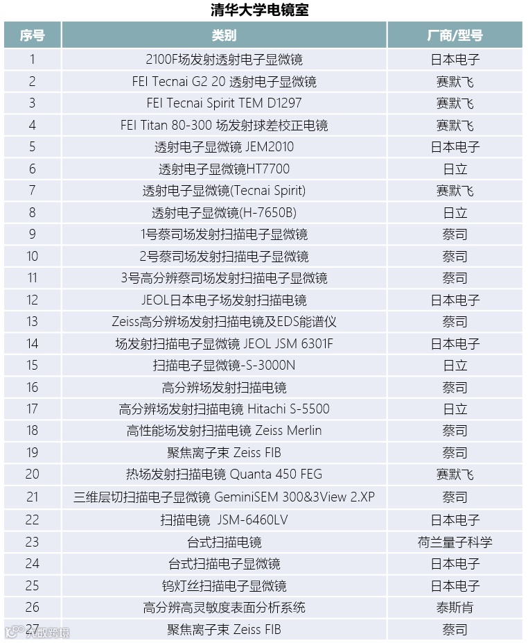 从竞争格局来看,扫描电镜领域,赛默飞、蔡司、日本电子、日立四家企业在我国的市占率合计在90%以上;国内只有中科科仪、国仪量子两家企业有了实质性的规模销售,但还是以钨灯丝扫描电镜为主;钨灯丝台式扫描电镜主要是泽攸科技。透射电镜、离子束电镜、场发射台式电镜,国内目前都是空白。据笔者不完全统计,北京大学、清华大学电镜室的电镜(透射电镜、扫描电镜、聚焦离子束电镜)品牌,主要是赛默飞、蔡司、日本电子、日立这四大家族。据业内专家介绍,目前受美国对我企业出口管制的影响,国内半导体行业企业、北京大学等高校已经难以再买到如赛默飞的高端电镜产品。