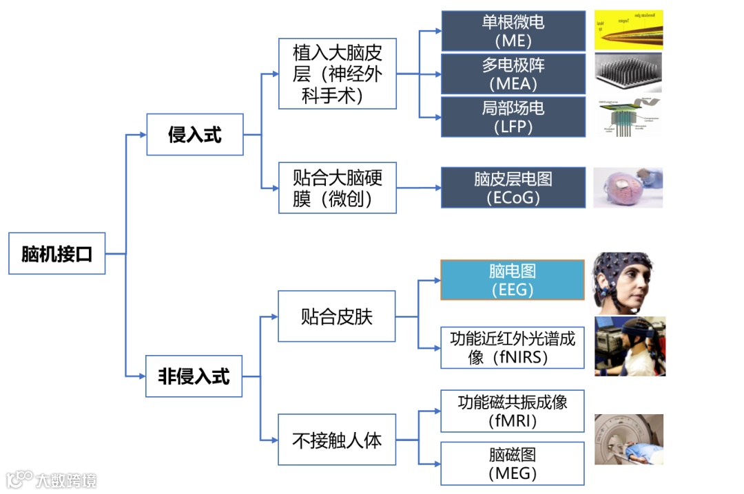 按照信号读取采集的方式,可分为:1)非侵入式脑机接口,例如EEG(颅外脑电)、MEG(脑磁图)、fMRI(功能核磁共振成像);2)ECoG(皮层脑电图)微创式脑机接口;3)植入式脑机接口等。侵入程度越高,信号衰减小,信噪比和空间分辨率高。