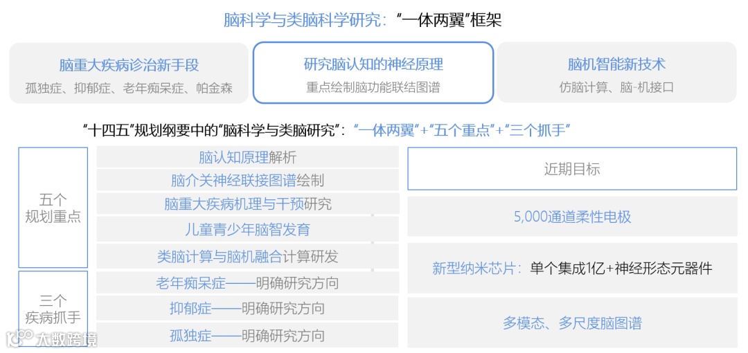 我国同样非常重视脑科学的研究,并将其上升为国家战略。中国脑计划,正式诞生于2016年。《“十三五”规划纲要》将“脑科学与类脑科学研究(Brain Science and Brain-Like Intelligence Technology)”列为“科技创新2030重大项目”,并提出了“一体两翼”的布局,以研究脑认知的神经原理为“主体”,以研发脑重大疾病诊治新手段和脑机智能新技术为“两翼”。此后,在《“十四五”规划》和《2035年远景目标纲要》中,脑科学被列为与生命健康和人工智能同等重要的国家战略性前沿科技与研究方向。