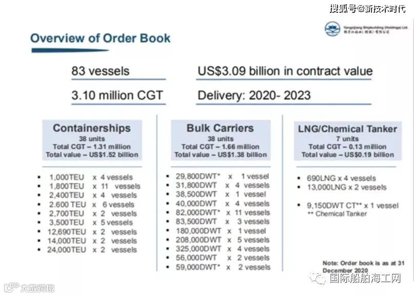 至此,扬子江船业集团手持订单为83艘,总价值约30.9亿美元,交付时间在2020年至2023年,其中包括集装箱船和散货船各38艘,LNG运输船/化学品船共7艘。以载重吨计算,这些手持订单载重吨位约占全国手持船舶订单量的7.7%。