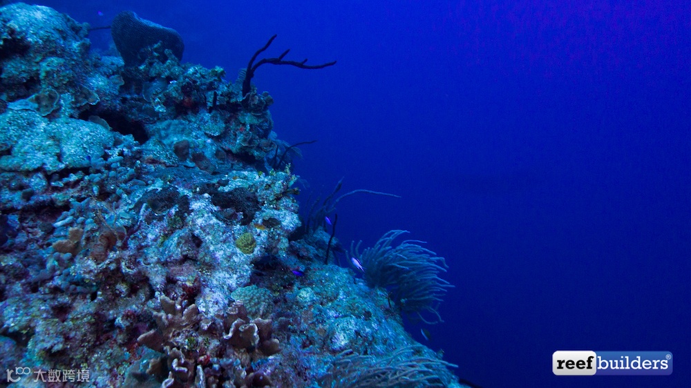 大开曼岛四周围绕着深墙。上图是在100英尺(30米)深的地方拍摄的,深墙一直探进海底深渊。