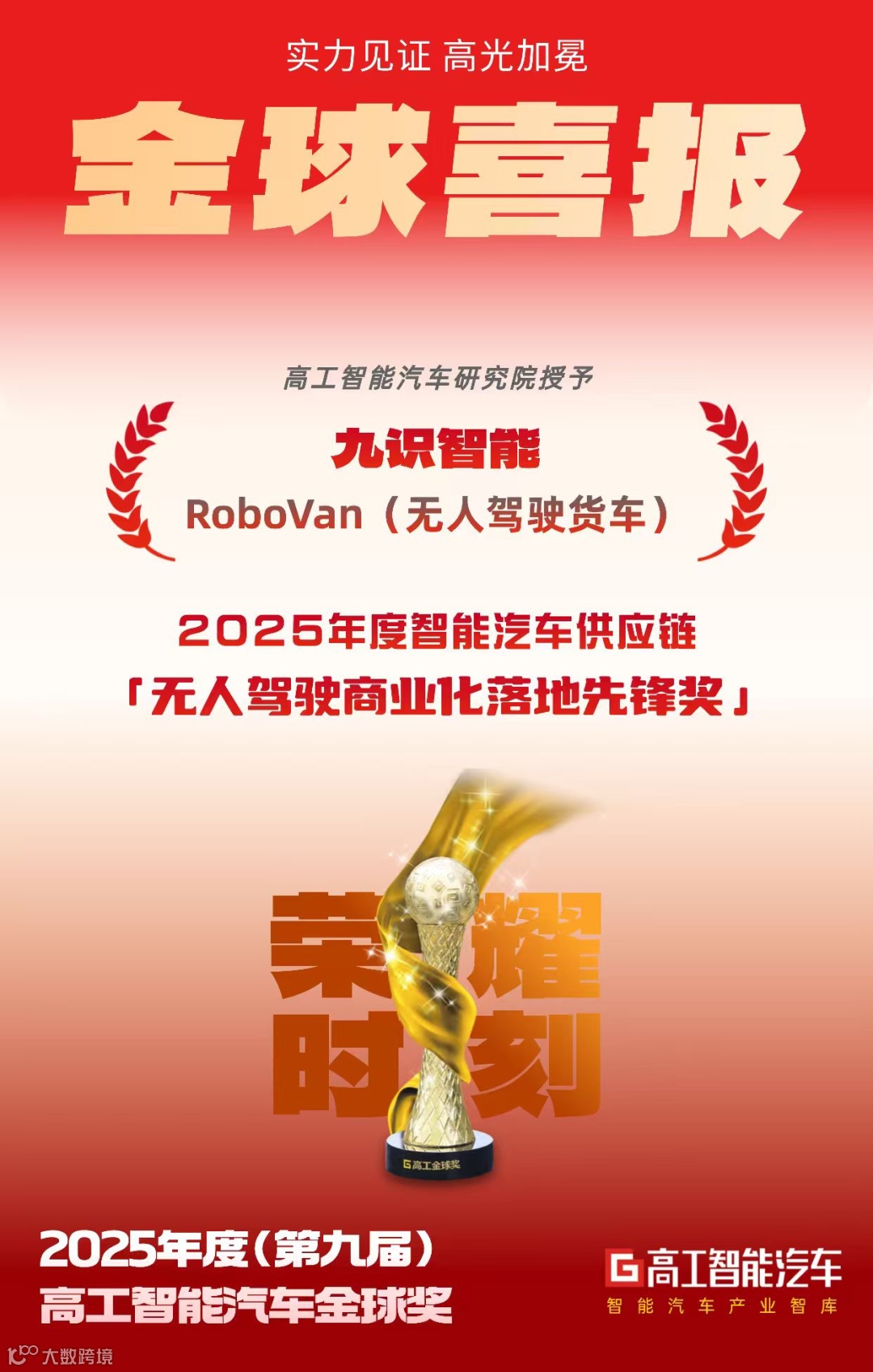 同期,在2025高工智能汽车年度金球奖评选中,九识智能凭借在城配物流场景的规模化运营实践与商业闭环能力,荣获 “无人驾驶商业化落地先锋奖” 。该奖项旨在表彰在自动驾驶商业化进程中实现关键突破并具备行业示范价值的创新企业。