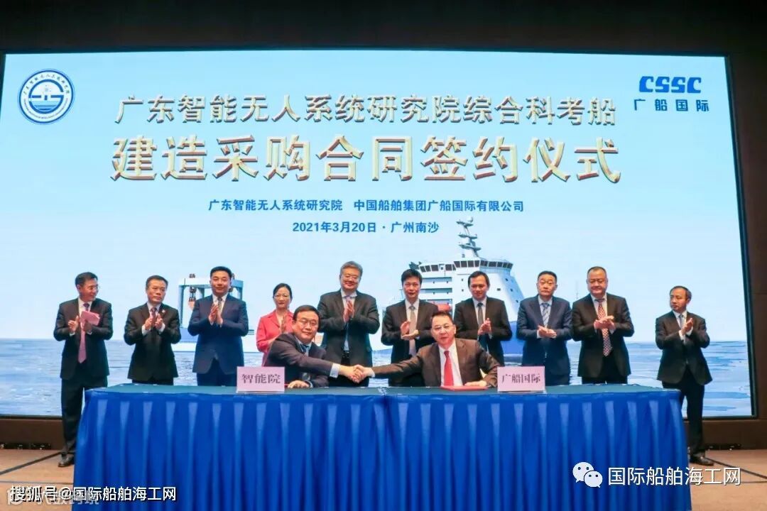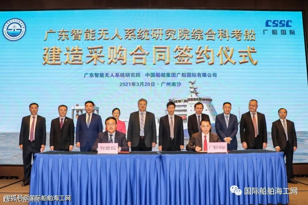 3月20日,中国船舶集团旗下广船国际有限公司与广东智能无人系统研究院在南沙签定一艘海洋综合科学考察船建造采购合同,该船最大作业排水量超万吨,建成后将成为国内排水量最大、性能最强的海洋综合科学考察船。