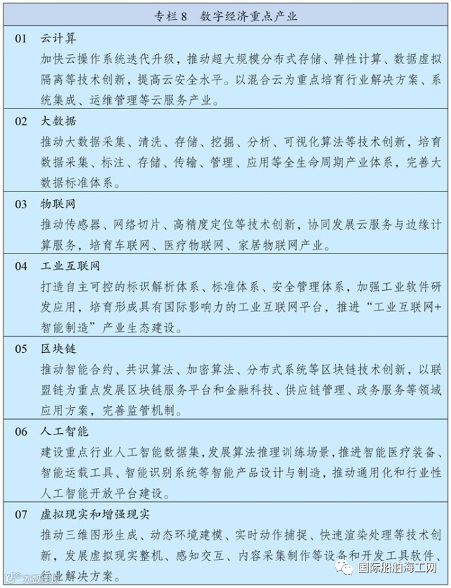 3月12日,国家第十四个五年规划和2035年远景目标纲要全文发布,其中对数字经济划重点。“十四五”规划和2035年远景目标纲要草案围绕“数字中国”单独成篇,提出到2025年,数字经济核心产业增加值占GDP比重提高到10%。数字经济的核心产业包括云计算、大数据、物联网、工业互联网、区块链、人工智能、虚拟现实和增强现实等。