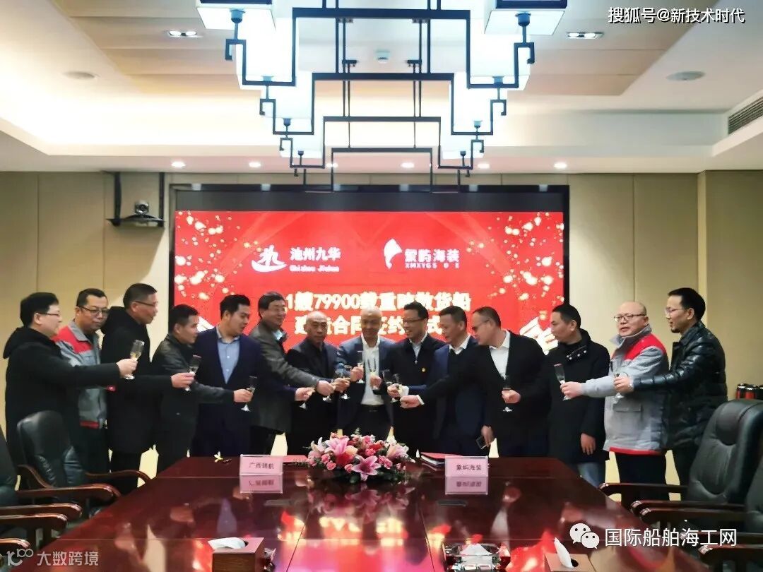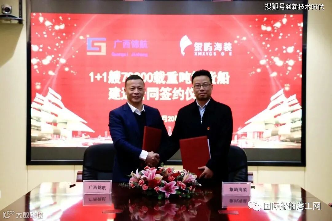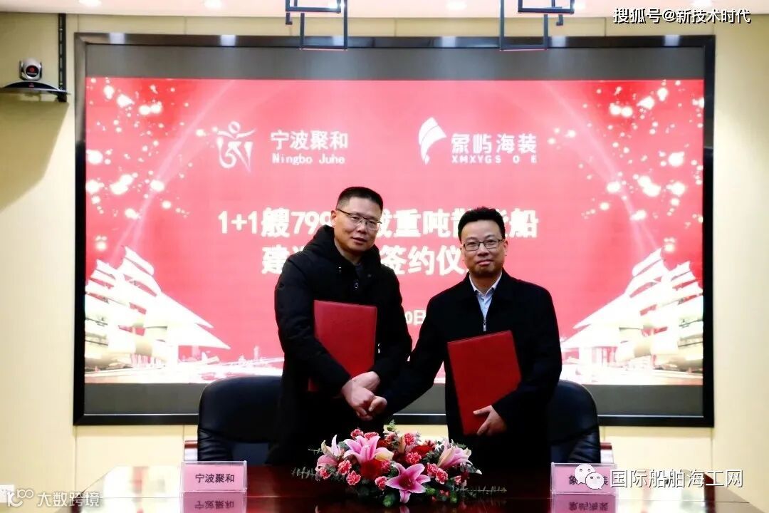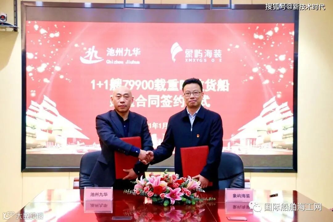 2021年1月20日,位于上海北长江北岸的象屿海洋装备有限责任公司分别与宁波聚和物流有限公司、安徽池州市九华船务有限公司以及广西防城港锦航船务有限公司各签订1+1艘79900DWT散货船造船合同。浙江宁波聚和董事长孙宏愿、总经理吴强;安徽池州九华董事长王国年;广西防城港锦航董事长林贻团、副董事长施巧峰;天海防务董事寻正来、易桥资本合伙人韩旭、象屿金象融资租赁副总经理高晟杰、象屿海装总经理秦伟民、总工程师严勇、营销总监杨俊生等共同出席签约仪式。