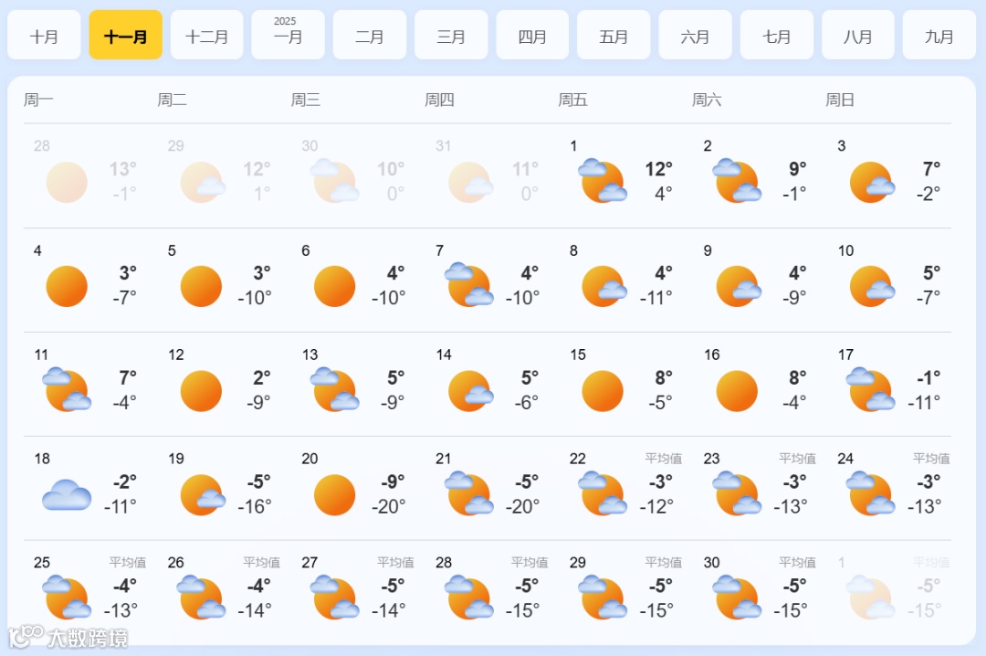 穿着建议:哈尔滨十一月寒冷,请准备足够的保暖衣物。