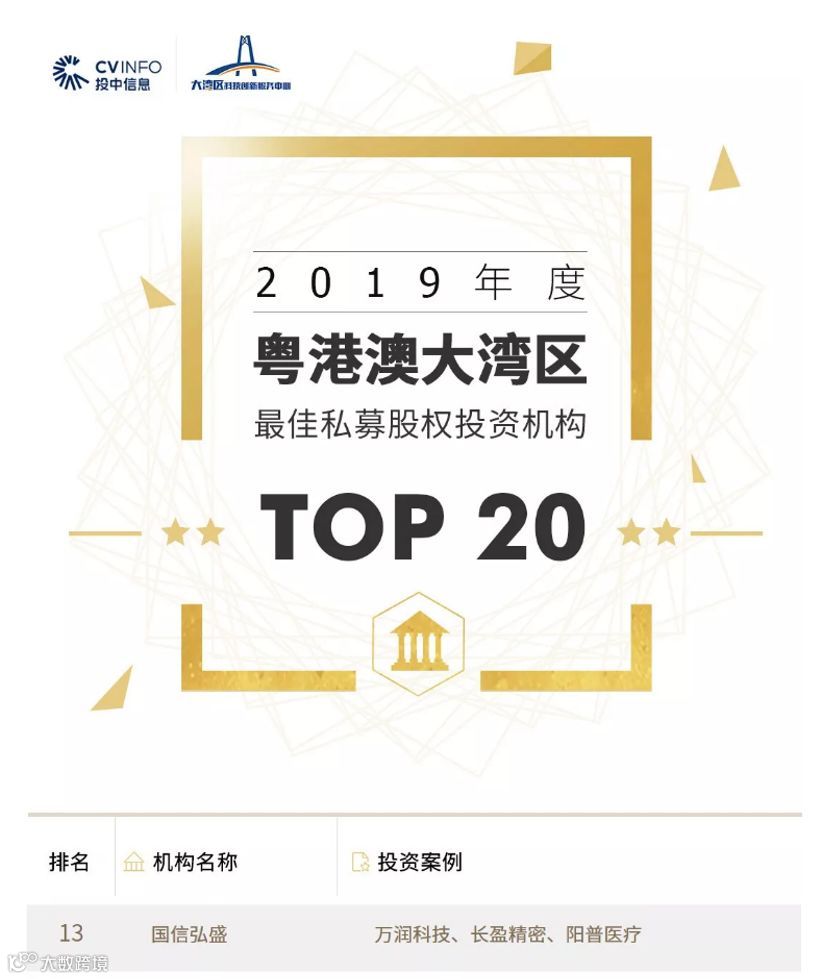 12月18日,在广州市科技局的指导下,投中信息与大湾区科技创新服务中心联合发布了2019年度粤港澳大湾区榜单。该榜单依据在管规模、投资及退出等评选指标,对粤港澳大湾区头部300余家股权投资机构及100家引导基金进行综合评定。国信弘盛入选“2019年度粤港澳大湾区最佳私募股权投资机构TOP20”。