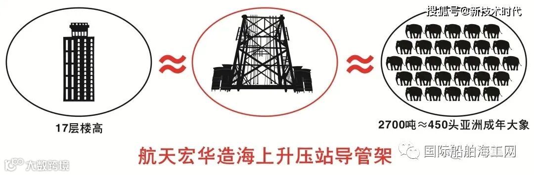 该导管架近17层楼高,重约常规导管架的3倍,达2700吨;其底部尺寸约为常规的2倍,略超六分之一足球场,如此规模在目前亚洲排名也是数一数二。