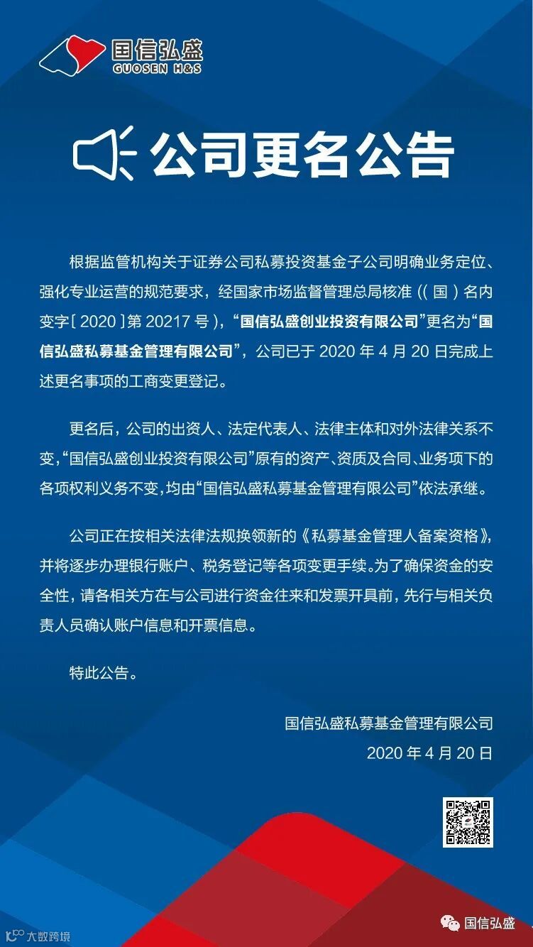 导读:更名后,公司出资人、法定代表人、法律主体和对外法律关系不变,均由“国信弘盛私募基金管理有限公司”依法承继。