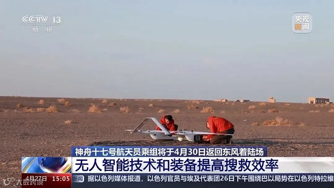 4月30日17时46分,神舟十七号载人飞船返回舱在东风着陆场成功着陆,载人飞行任务取得圆满成功。期间,央视新闻详细报道了东风着陆场航天搜救队依托无人智能先进技术和装备,提高航天搜救效率的情况。