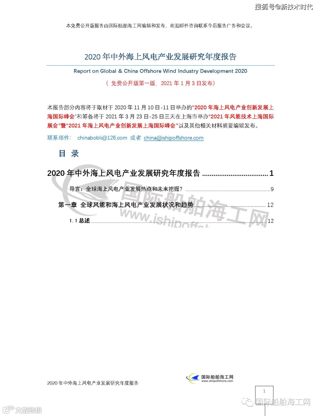 将免费公开的年度报告,将取材于2020年11月10日-11日举办的“2020年海上风电产业创新发展上海国际峰会”和筹备将于2021年3月23日-25日三天在上海市举办“2021年风能技术上海国际展会”暨“2021年海上风电产业创新发展上海国际峰会”以及其他相关的材料,摘要编辑发布。