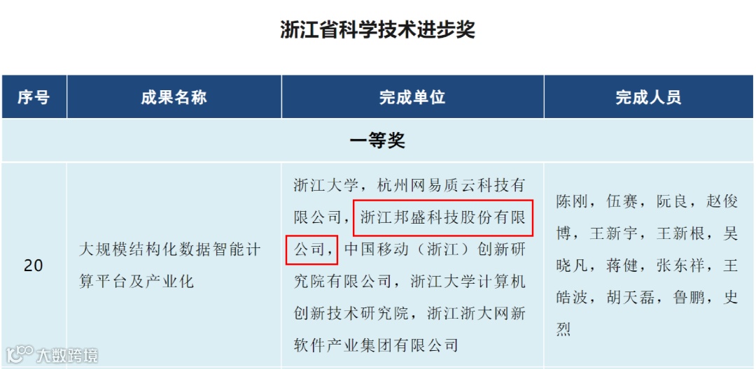 11月22日,加快建设创新浙江因地制宜发展新质生产力动员部署会暨全省科学技术奖励大会在杭州举行。会上宣布,邦盛科技作为主要参与单位完成的“大规模结构化数据智能计算平台及产业化”项目荣获浙江省科学技术进步奖一等奖。