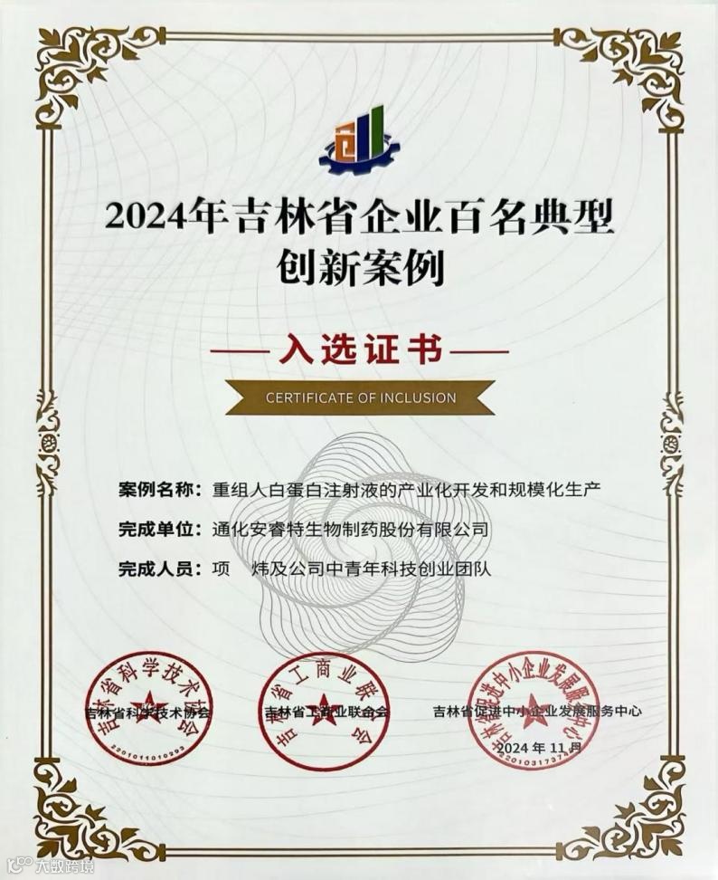 近日,由吉林省科学技术协会、吉林省工商业联合会、吉林省促进中小企业发展服务中心联合组织开展的吉林省企业典型创新案例评选结果揭晓,经过层层筛选和严格评审,安睿特生物凭借其卓越的创新能力,成功入选吉林省企业典型创新案例。