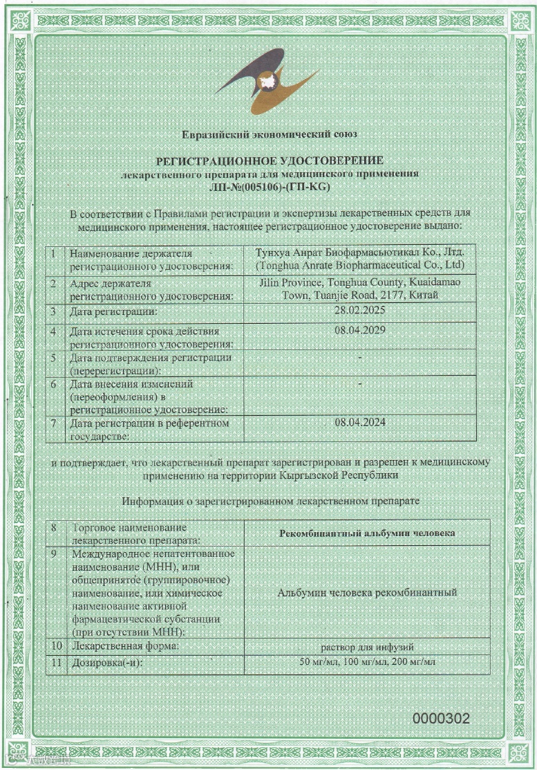 安睿特重组人白蛋白获吉尔吉斯斯坦MAH许可