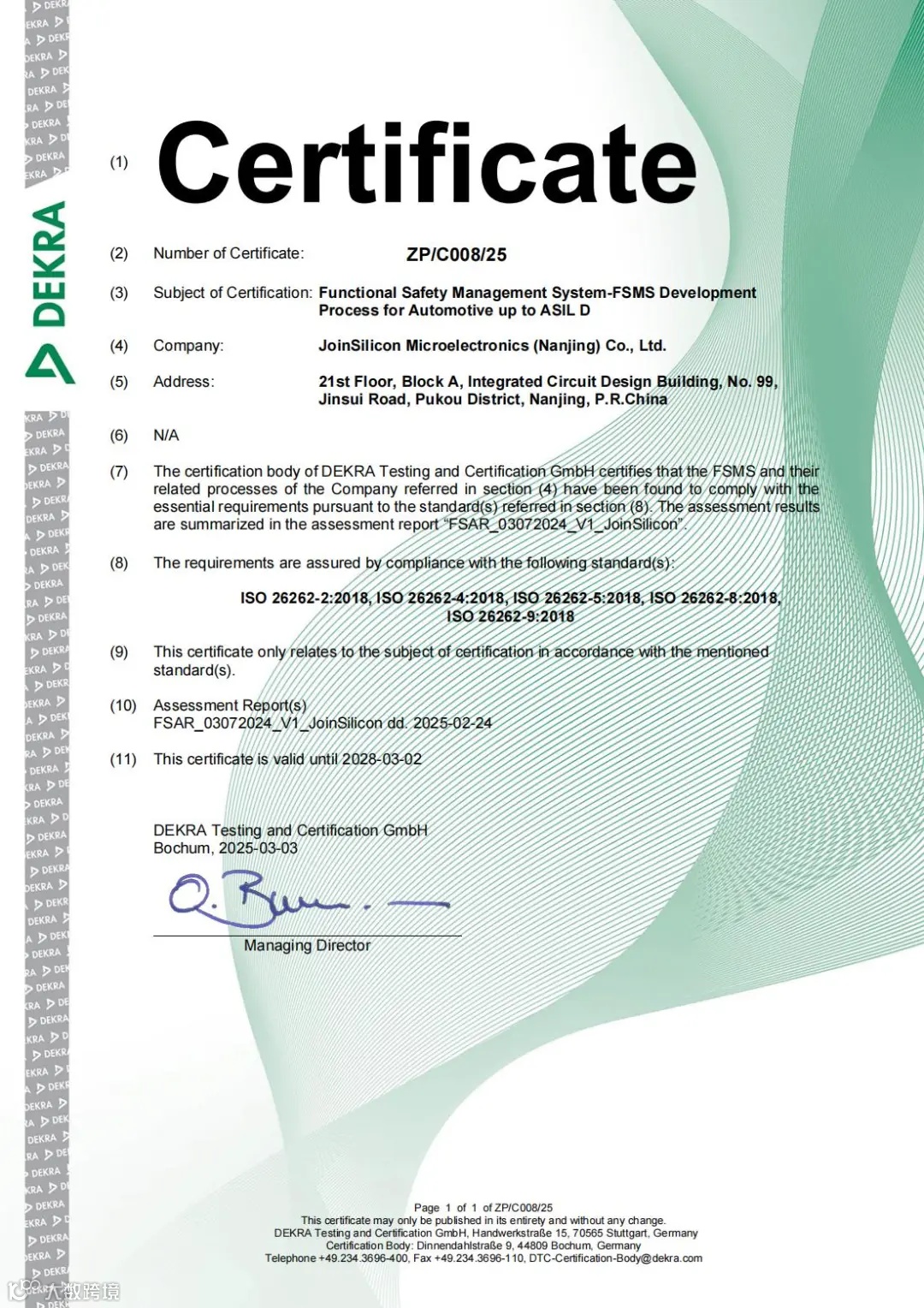 日前,中茵微通过 ISO 26262:2018 ASIL-D 汽车功能安全管理体系认证,并获得由全球领先的检验检测认证机构DEKRA德凯颁发的功能安全流程认证证书。