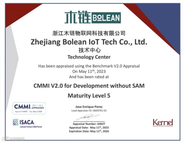 近日,浙江木链物联网科技有限公司顺利通过全球软件领域申请难度最大、规格最高的软件开发能力成熟度认证CMMI 5,并获得CMMI研究院颁发的CMMI成熟度五级认证证书。这标志着木链科技在产品研发能力、项目管理能力、实施交付能力等多方面均达到国际水平。