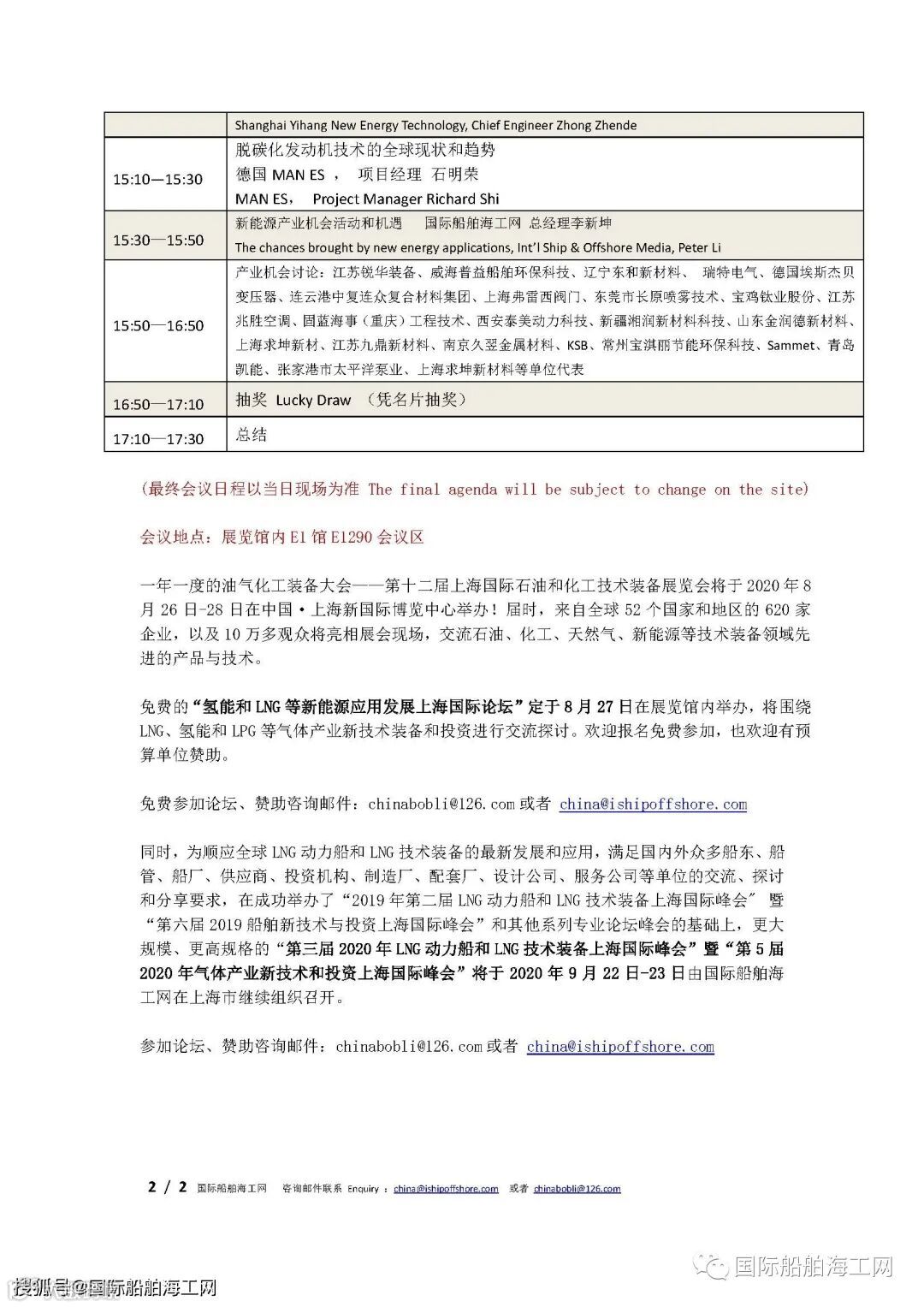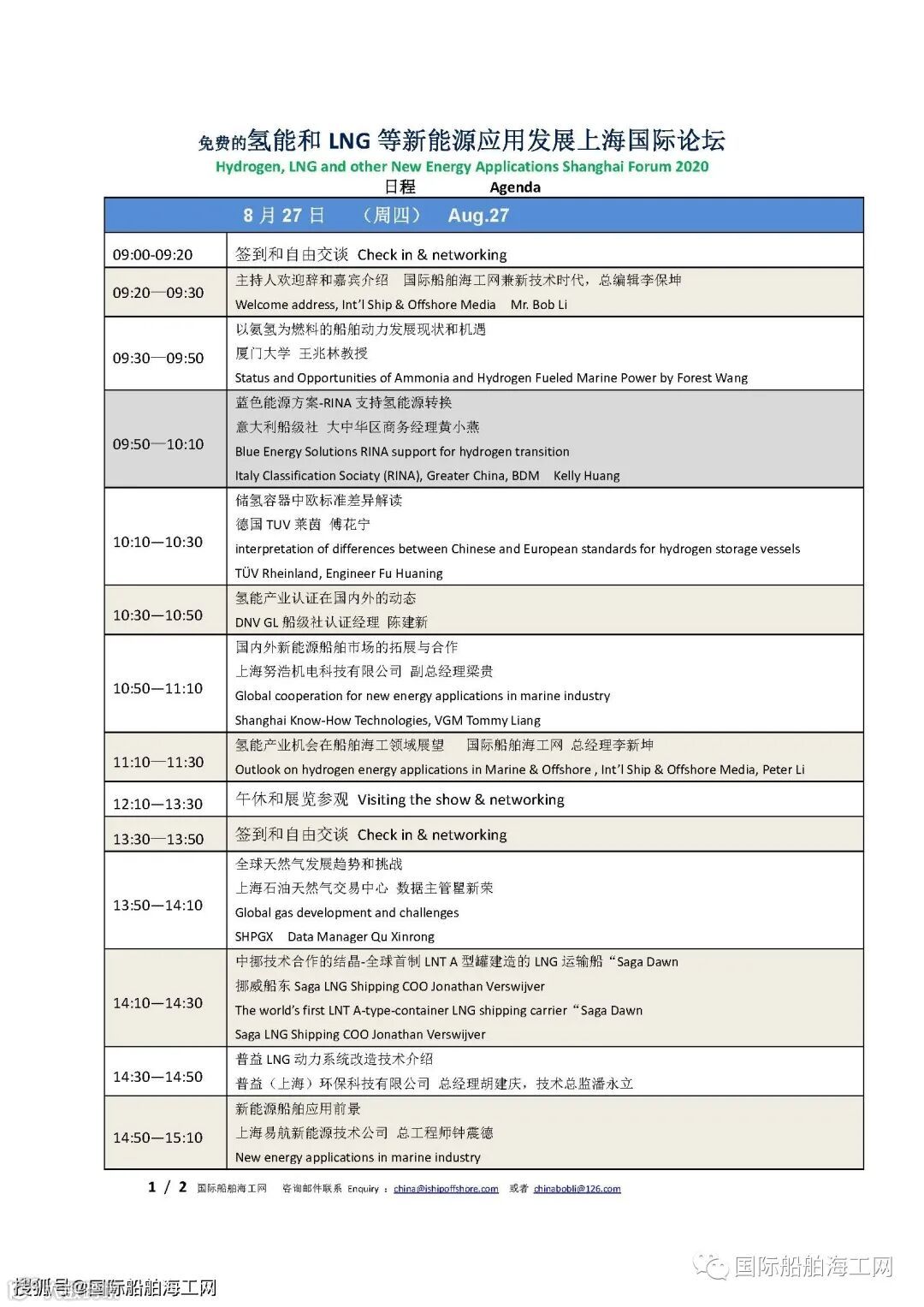 免费的LNG、氢能等新能源技术装备和投资上海国际论坛将于2020年8月27日在上海市举办日程如下: