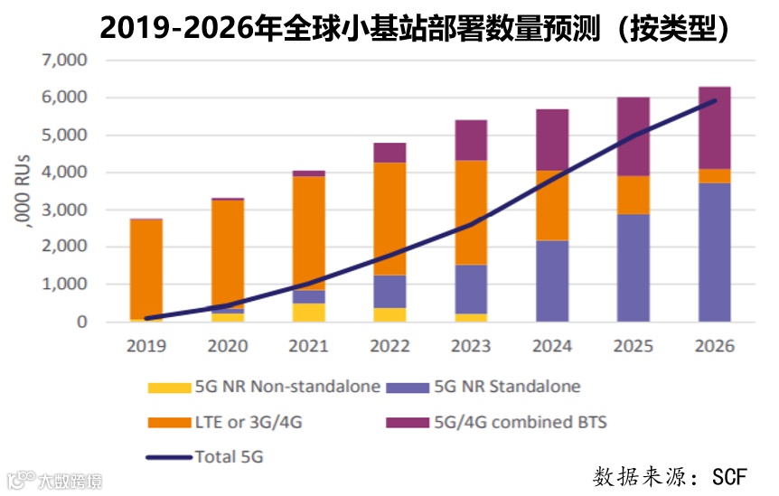 5G时代,小基站将成为通讯基站市场重要的增量点。根据SCF(Small Cell Forum,小基站论坛)发布的市场预测报告,2020-2026年期间全球小基站市场会达到18%的复合增长率,2026年全球将累计部署4900万个小基站射频点,而中国和东南亚地区累计部署的小基站数量将占全球总量的36%。5G小基站的出货量有望从2021年开始持续放量,2024年全球增速超过33%,2026年出货量达到600万个。