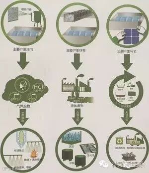 生产制造过程中会产生一定的废气、废水或固体废物,统称三废,晶体硅光伏制造过程也不例外。下图展示了晶体硅光伏制造过程中产生“三废”种类、主要产生环节及处理措施。光伏制造过程中产生的绝大部分污染物经简单护理后即可达到国家安全排放标准,处理过程简单且工艺成熟,对环境影响比较小;个别集中光伏生产行业持有的污染物,如四氯化硅、废砂浆以及氟化物,如下图所示。