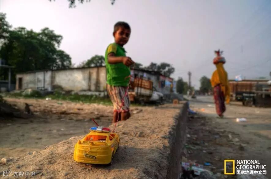 在印度东北部的西里古里,一个小男孩正拽着玩具车玩耍。