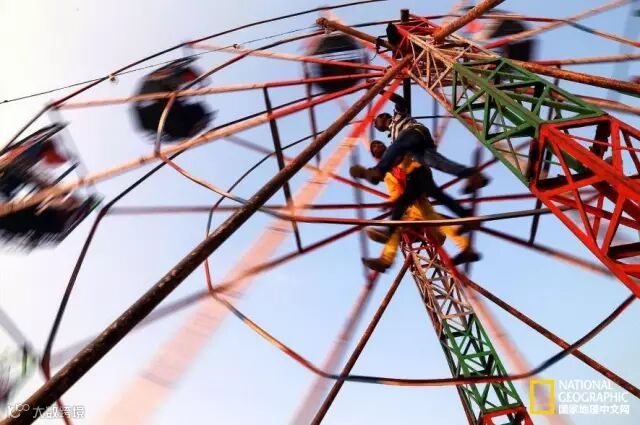 摄影师Aditya Waikul告诉我们,在印度西南部的纳西克市,这个“摩天轮”是靠人力驱动的。国家地理频道的编辑Monica Corcoran评价说:“年轻人略略模糊的脸,让这一不可思议的时刻变得更加真实。”