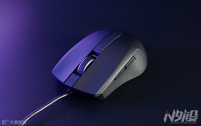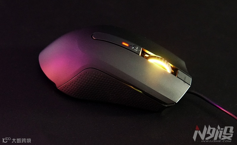 方案和绝大部分入门级鼠标一样,仅有滚轮区有RGB,滚轮露出体积较大,但全亮和低亮区别不大。4档DPI灯光反馈很直观,取代那些用灯色显示档位的设计值得好评。