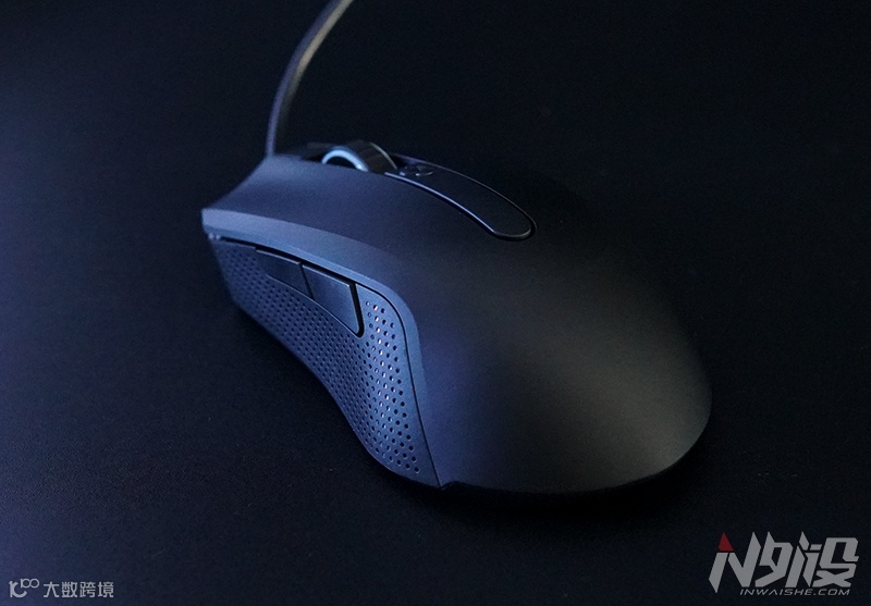 侧裙终于回归到传统的嵌入式,完全和鼠标侧面贴合,左侧裙拇指摆放点陷得恰到好处,加上橡胶侧裙密布圆形凹点,形成了很大的摩擦力和抓力。至于右侧裙,收腰不如左侧裙明显,整面线条都相对平缓,留下的空间刚好满足大手型用户的无名指和尾指摆放。两颗扁平化侧键完全不硌手,对于那些不常用侧键的人来说,感知性做到了最低。